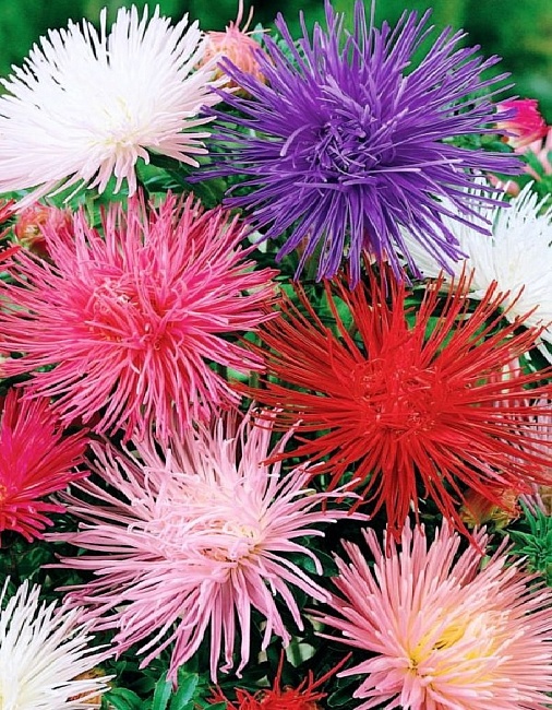 Густомахровая игольчатая астра! Растения высотой около 60 см. Соцветия густые длинноиголчатые, белые, кремово-желтые, серебристо-голубые, фиолетовые, серебристо-розовые, красные. Цветет в августе-сентябре. Используют очень широко: для посадки в сборные цветники группами, на рабатки – рядами и для срезки.