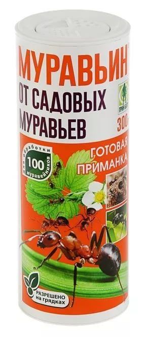 Специальное средство от вредных садовых муравьев. Повышенная безопасность препаративной формы выгодно отличают МУРАВЬИН от аналогичных препаратов. Готовый к применению препарат очень удобен — не нужно ни с чем смешивать или разводить водой. Расход препарата - 20-30 г на 10 кв.м., внесение в муравейник на глубину 2-3 см
