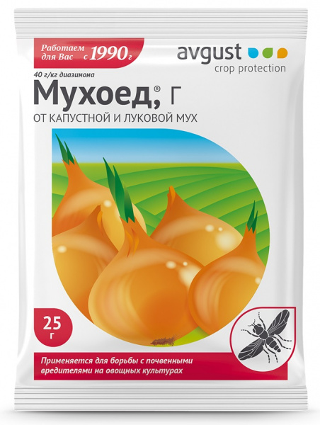 Поможет защититься от луковой и капустной мух, а заодно и от почвенных мушек. Его гранулы вносят в грядки при посадке с последующим рыхлением. Под цветочные растения гранулы Мухоеда вносятся поверхностно с последующей заделкой в почву.